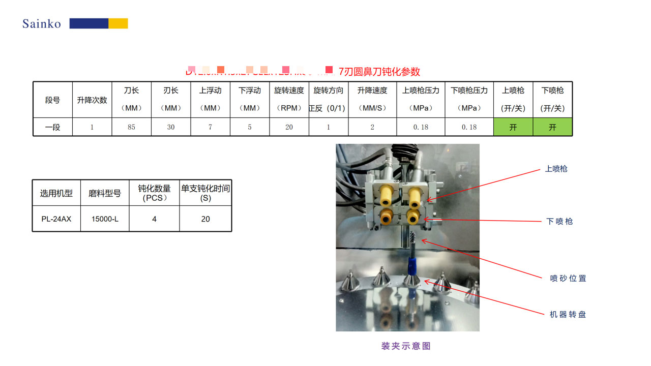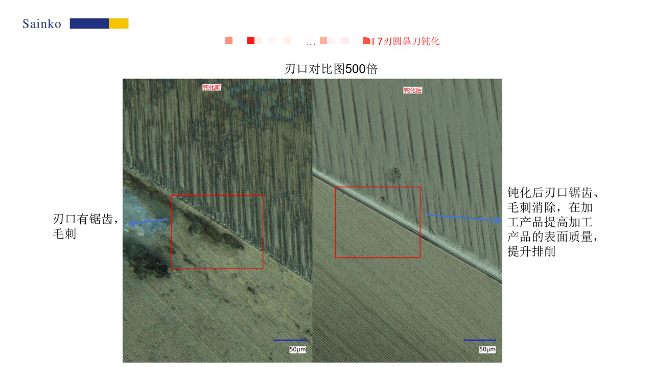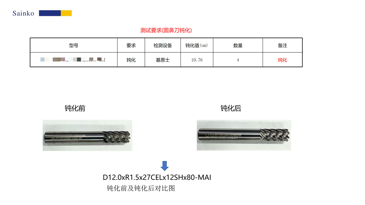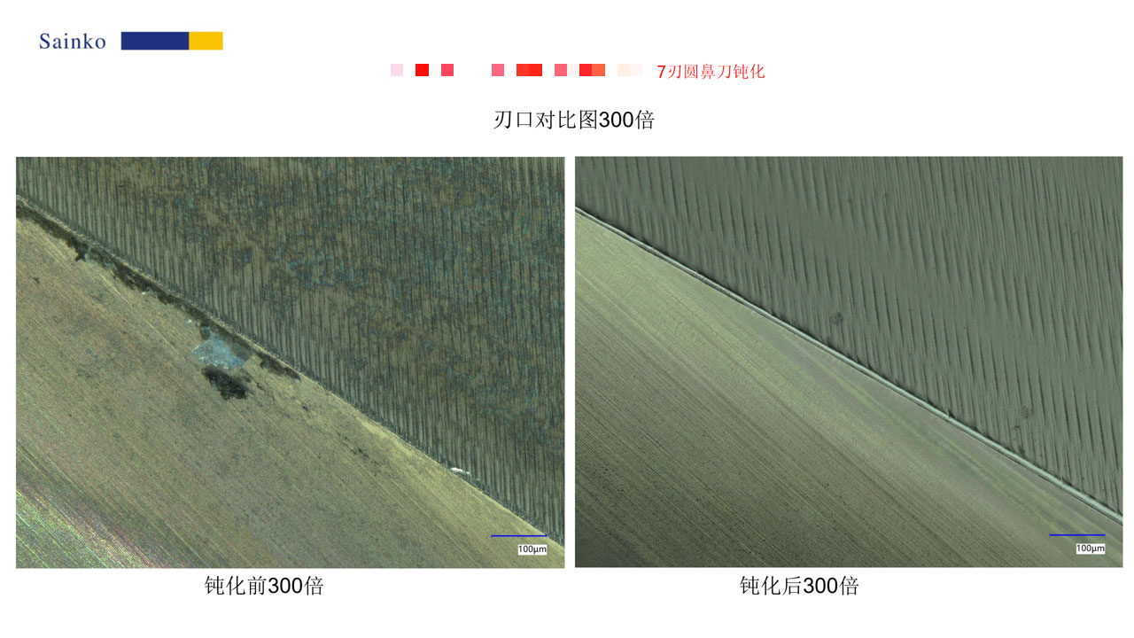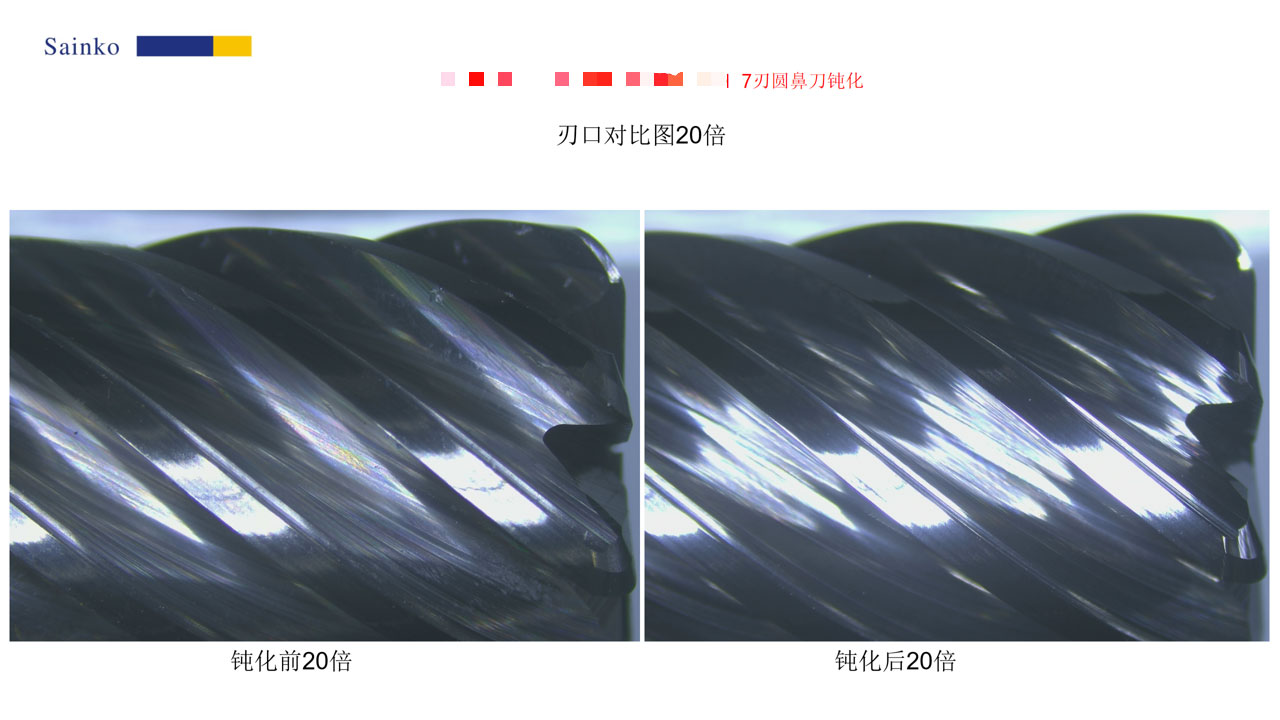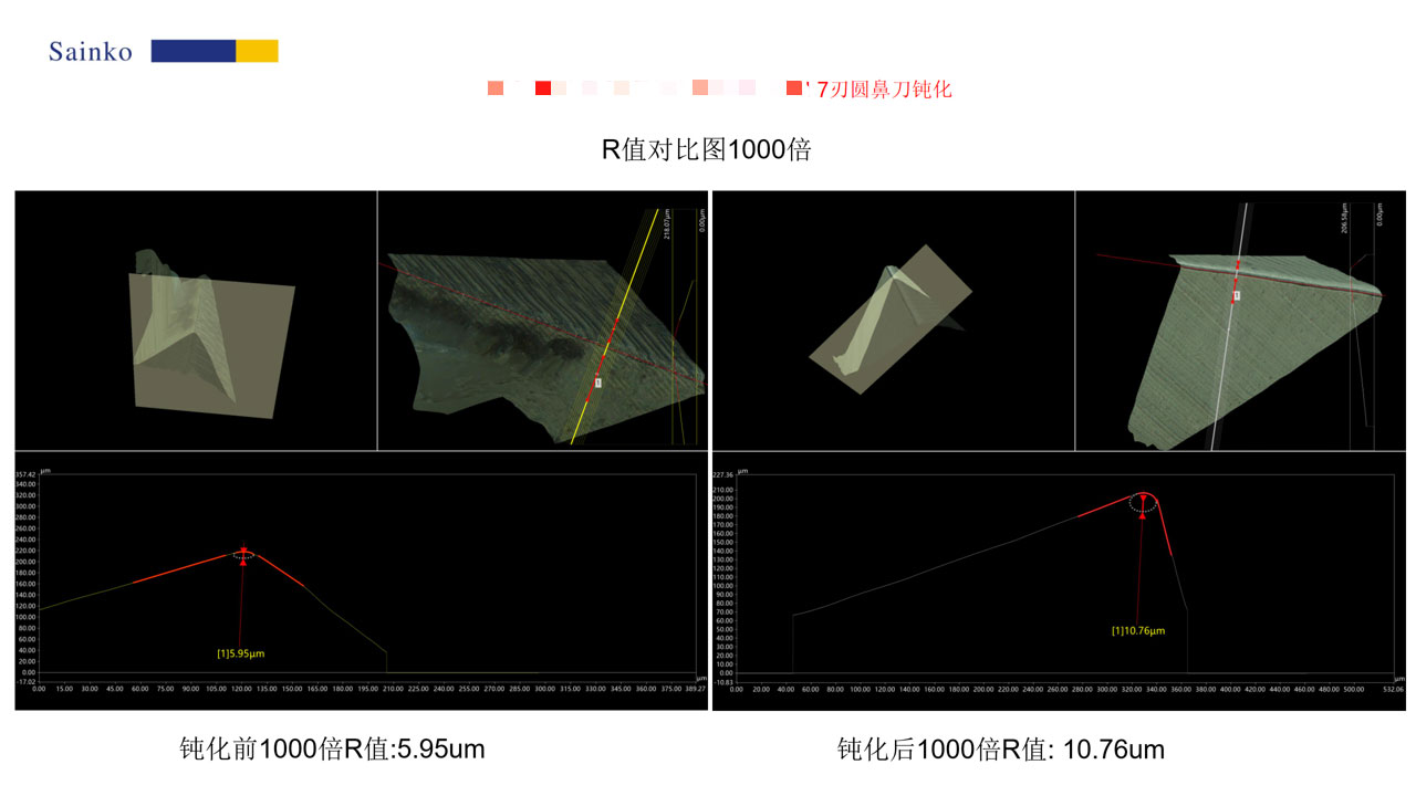 2026-01-24本次对 7 刃圆鼻刀的钝化测试,使用 PL-24AX 机型、15000-L 磨料,单支处理时长 20 秒,共完成 4 支刀具的钝化作业。经 500 倍显微镜观测,钝化后刃口的锯齿与毛刺基本消除,可有效提升加工表面质量与排屑性能;1000 倍测量结果显示,钝化后 R 值稳定达到 10.76μm,符合预设目标,验证了该钝化工艺的有效性与可靠性。