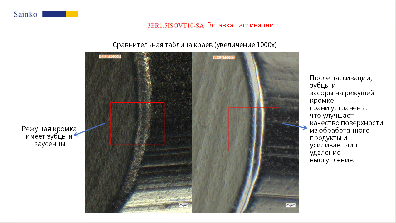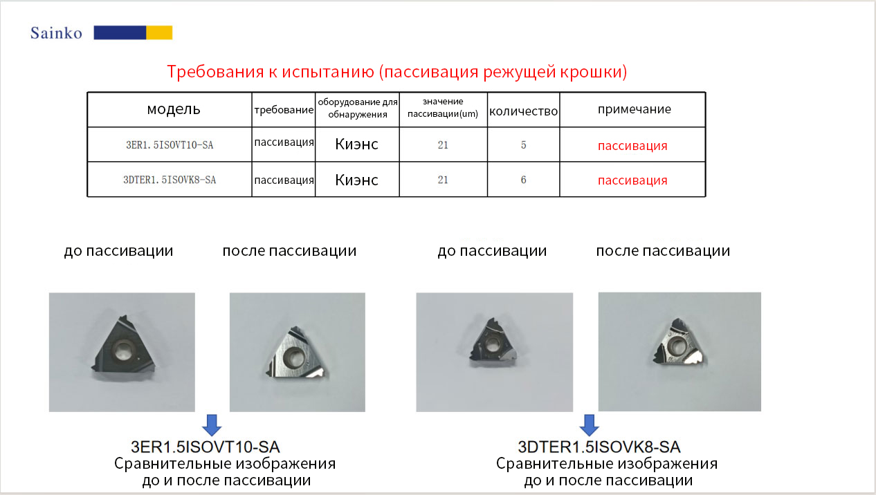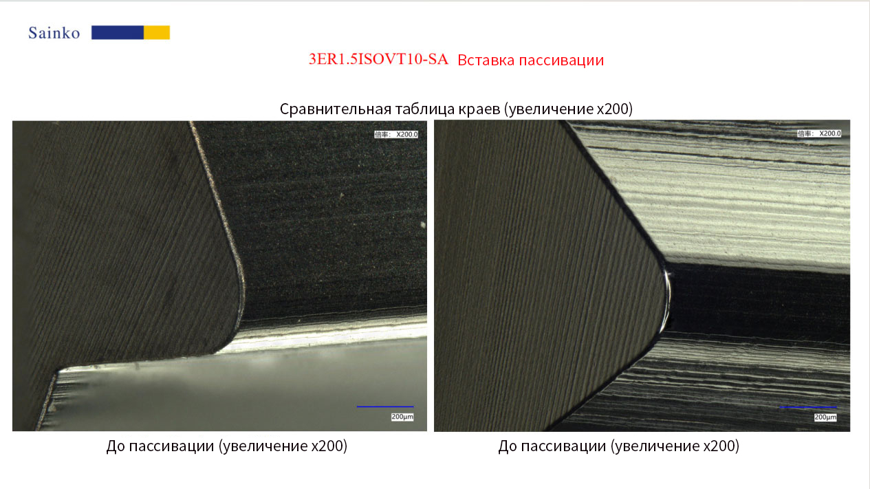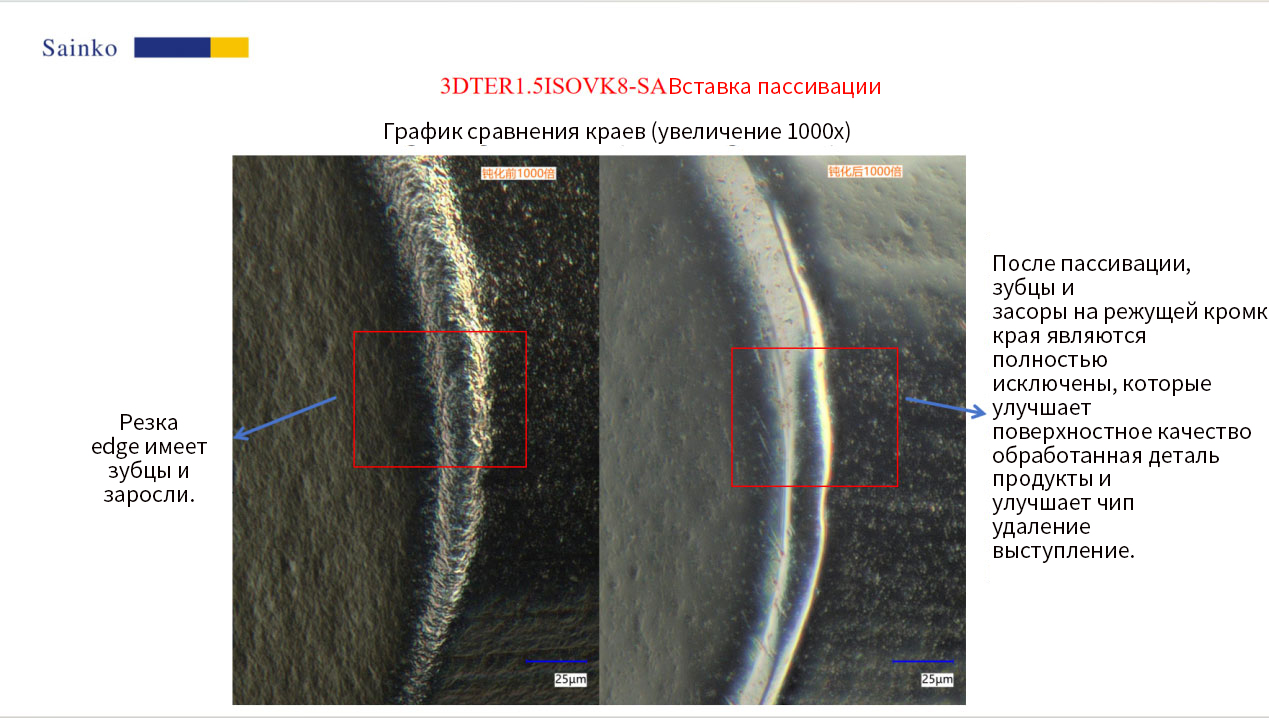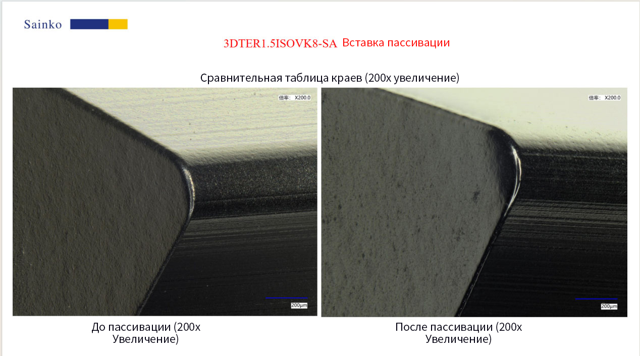 Путем проверки с помощью оборудования Keyence и микроскопического наблюдения (увеличение 200 и 1000 раз) было подтверждено значительное улучшение: на обеих режущих гранях перед пассивацией присутствовали заметные дефекты, такие как зубцы и заусенцы. Перед пассивацией значения R для 3ER1.5ISOVT10-SA составляли 17,94 мкм, а для 3DTER1.5ISOVK8-SA — 27,97 мкм. После пассивации дефекты зубцов и заусенцев значительно уменьшились, а значения R были отрегулированы до 21,72 мкм и 21,61 мкм соответственно, достигнув целевых значений.
