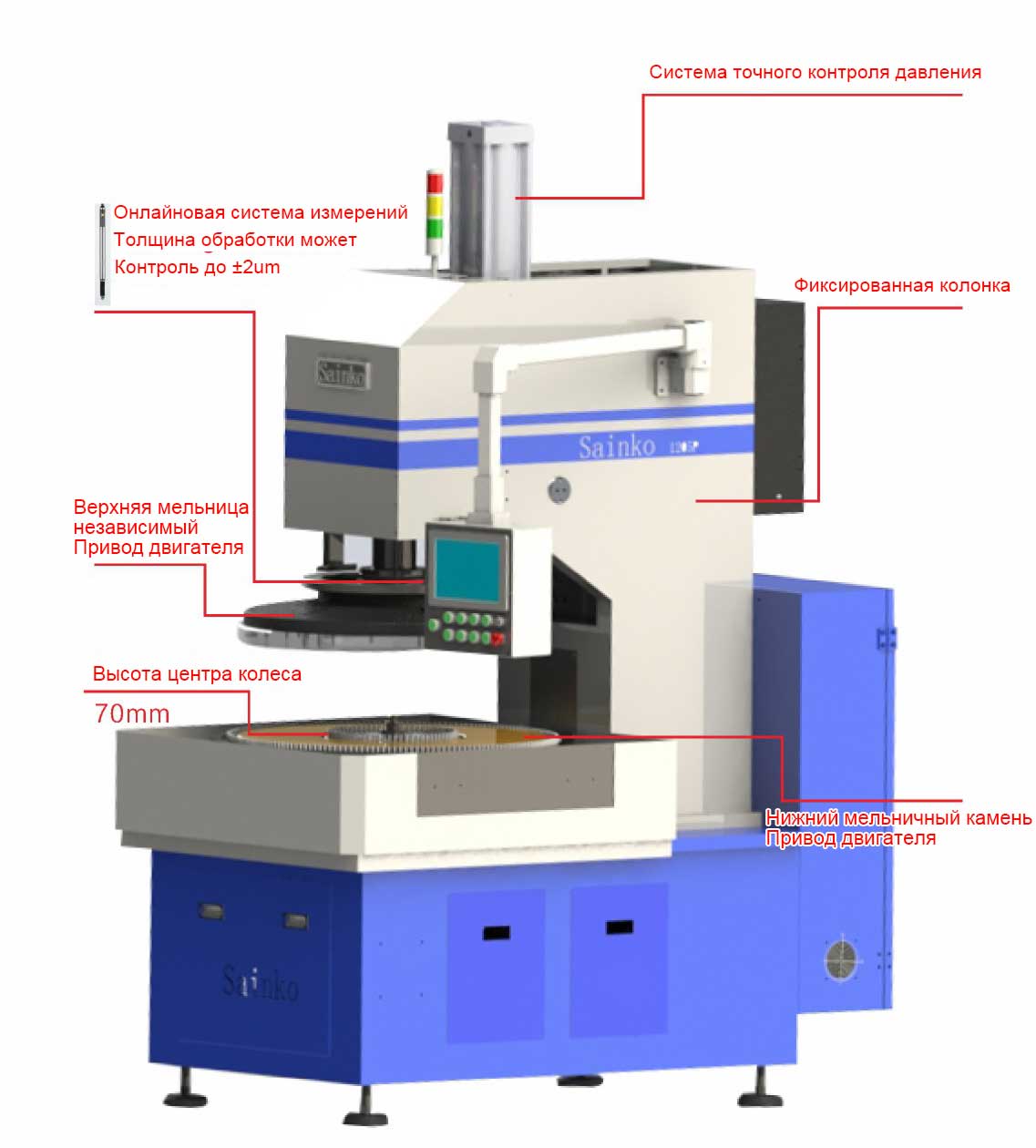 · Верхний и нижний диски, центр с независимым приводом двигателя, плюс замедление плавное; Использование высокостальной конструкции кузова, стационарной стойки, при обработке под большим давлением не вызывает дрожания, так что обработка более быстрая и стабильная