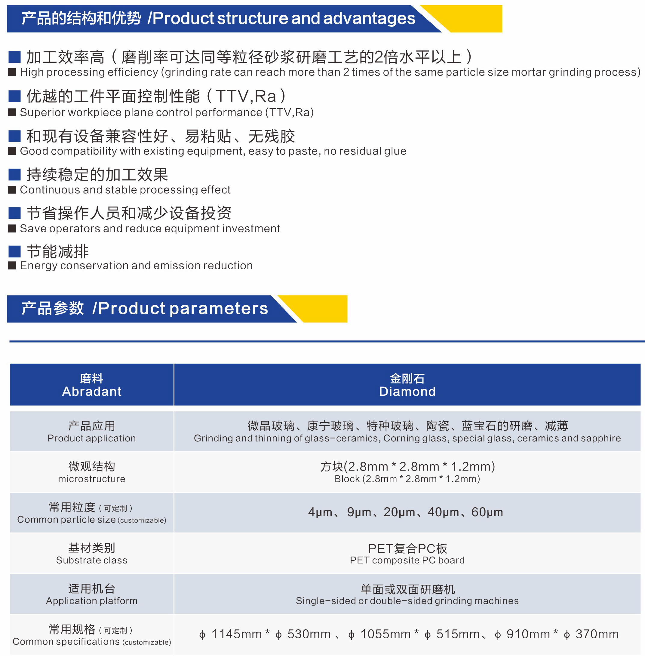 圣高钻石研磨垫是电子精密研磨的[敏感词]解决方案,目前普遍使用的5种类型,根据粒径分为4mic、9mic、20mic、40mic、60mic(可定制),主要应用于微晶玻璃、康宁玻璃、手机玻璃盖板减薄,摄像头保护后盖减薄,光学平面玻璃,蓝宝石窗口片,碳化硅半导体片,陶瓷片,以及各种混合产品的冷加工,研磨减薄。